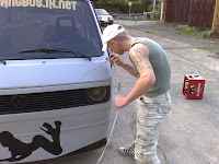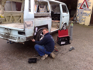 Das Große schlachten hat nun begonnen. Zuerst mußten die guten alten Fuchsfelgen wegen Geldnot raus und dafür kamen paar neue Porschefelgen 17" auf den Bus. Der Bus wurde komplett leer gemacht und Roststellen wurden behandelt oder durch komplette Bleche ersetzt.