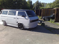 So kam unser Bus an. Für 1000€ hat ein freundlicher Mann aus Chemnitz uns diesen coolen VW Bus (T3 ttinger) mit Porsche Fuchs Felgen, Porsche Bremsanlage usw. verkauft. Der Bus hatte zwar schon viele Roststellen und war innen auch nicht mehr der Beste, doch das störte uns kein bischen. Die Bremsanlage und Felgen sowie der Motor, machten alles wieder gut :-)